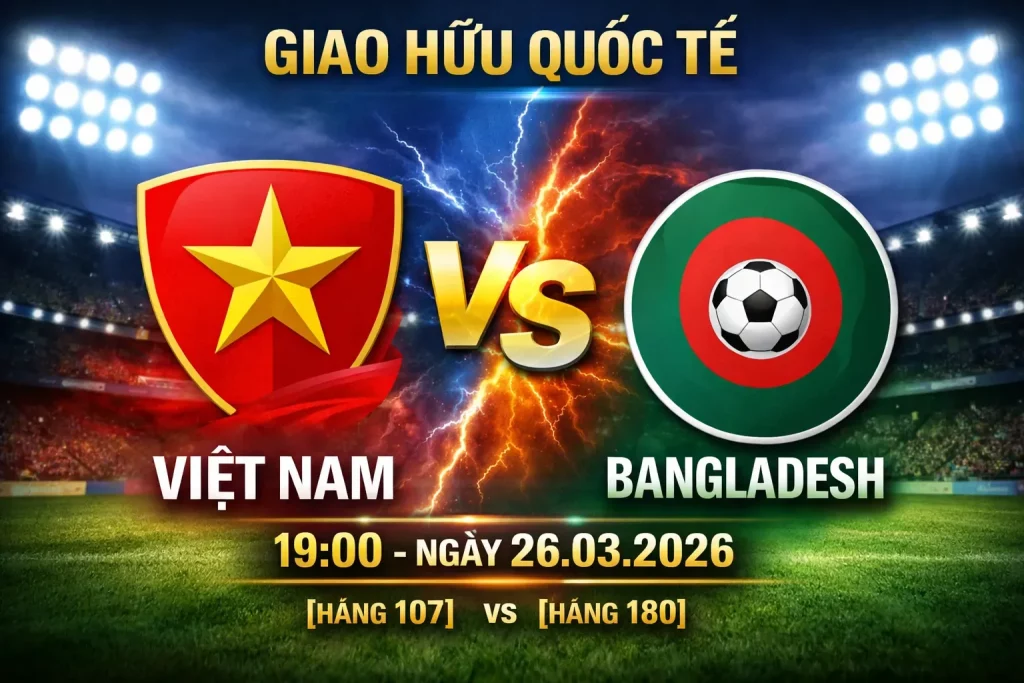 Trận đấu thuộc khuôn khổ Giao hữu quốc tế giữa Việt Nam và Bangladesh diễn ra lúc 19:00 ngày 26/03/2026 đang thu hút sự chú ý lớn từ người hâm mộ Đông Nam Á lẫn giới đầu tư bóng đá châu Á. Đây là cặp đấu có sự chênh lệch khá rõ rệt về vị thế trên bảng xếp hạng FIFA khi Việt Nam đứng hạng 107, trong khi Bangladesh đứng tận vị trí 180. Dù chỉ là một trận giao hữu, nhưng với tính chất thử nghiệm đội hình, rà soát chiến thuật và tạo đà tâm lý cho các chiến dịch sắp tới, màn so tài này vẫn mang ý nghĩa chuyên môn đáng kể.